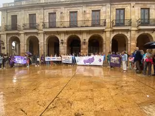 La plaza de la Constitución, en Oviedo, ha acogido en la tarde de este viernes una concentración convocada por el colectivo 8M Movimiento Feminista en Asturias para pedir la destitución del presidente de la Real Federación Española de Fútbol (RFEF), Luis Rubiales.