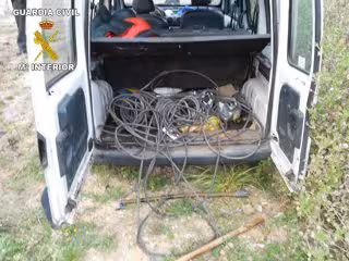 Posteriormente, la Guardia Civil localizó también una furgoneta Cangoo, propiedad de uno de los detenidos en un recinto de la zona, en cuyo interior había más cable del que no se ha podido determinar todavía la procedencia y herramientas con las que supuestamente se cortó el cable para extraerlo del conducto del alumbrado.