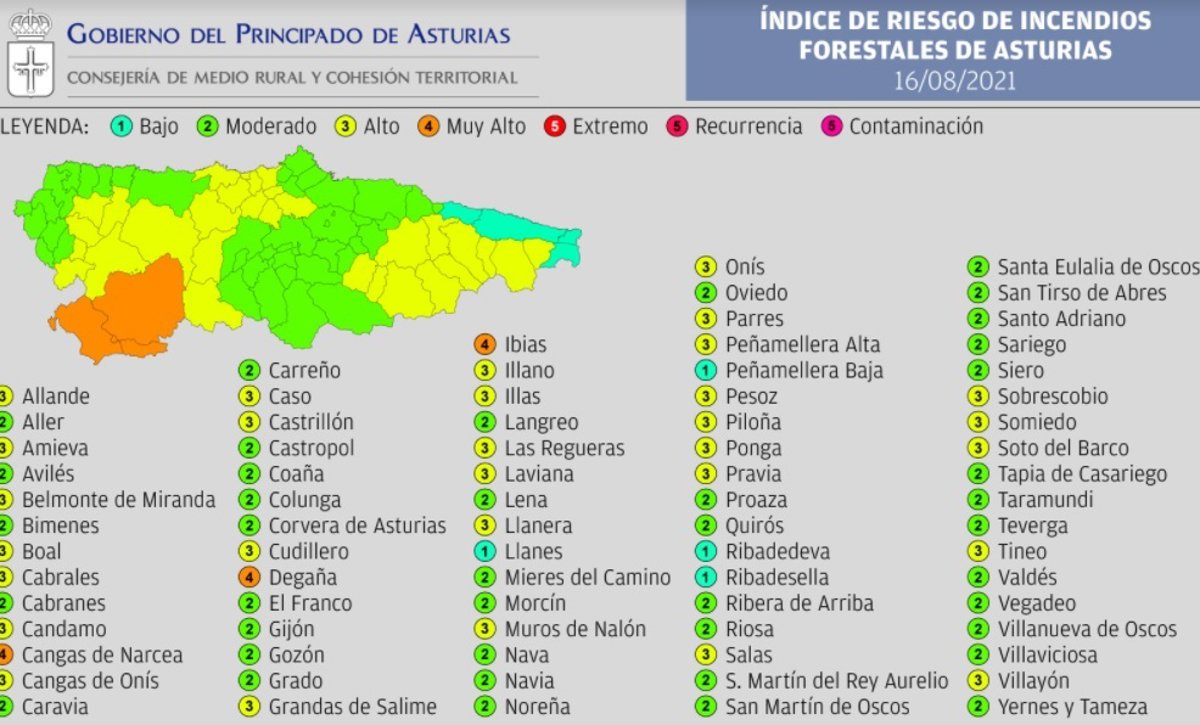 En el resto de Asturias el riesgo será 'Bajo' y 'Moderado', excepto en los municipios Allande, Amieva, Boal, Cabrales, Candamo, Cangas de Onís, Caso, Castrillón, Cudillero, Grandas de Salime, Illano, Illas, Las Regueras, Laviana, Llanera, Muros del Nalón, Onís, Parres, Peñamellera Alta, Pesoz, Piloña, Ponga, Pravia, Salas, Sobrescoio, Somiedo, Soto del Barco, Tineo y Villayón, donde habrá riesgo 'Alto'.