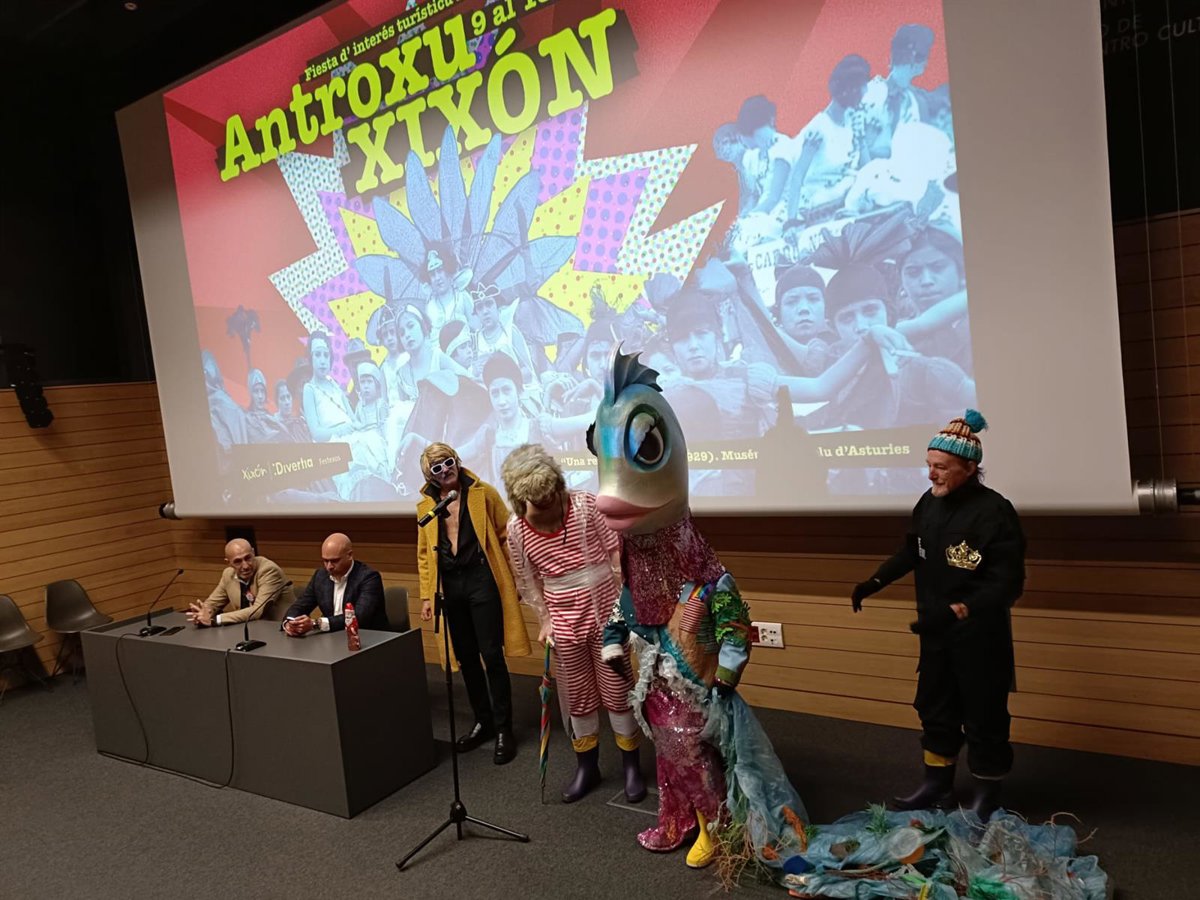 En la presentación, con posterioridad a la interpretación del personaje Agustín Fernández, habitual en el Antroxu gijonés desde hace años, han aparecido en escena los 'invocadores' de la sardina, protagonista del Carnaval, con la colaboración de las charangas.