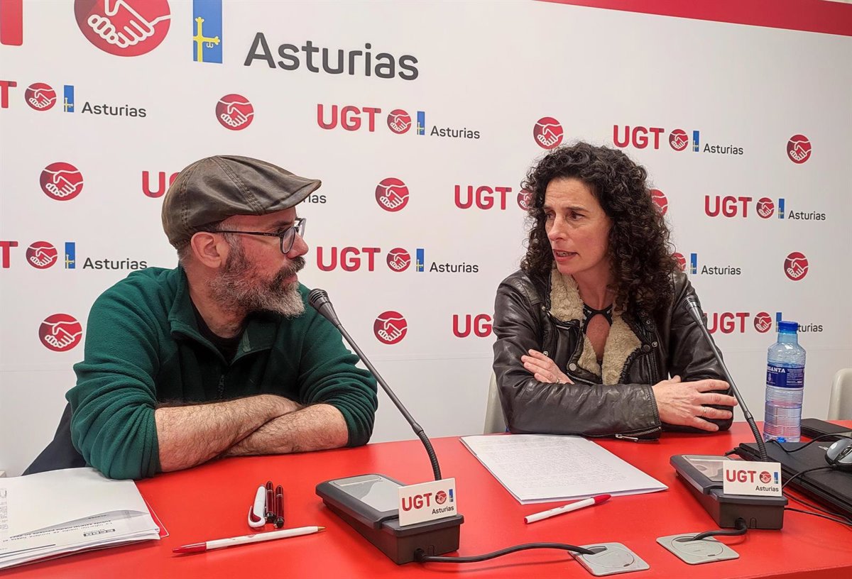 Los representantes del área de Acción Sindical de la FSS-CCOO de Asturias, y el Sector de Salud de UGT Servicios Públicos Asturias, Adrián Redondo y Tatiana Soto en rueda de prensa. - EUROPA PRESS