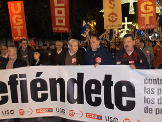 Los secretarios generales de UGT, CCOO y USO de Asturias, Justo Rodríguez Braga, Antonio Pino y Francisco Baragaño, respectivamente, han encabezado este lunes una manifestación en Oviedo --con salida desde la Renfe en la calle Uría- con motivo de la decisión del Gobierno central de la no revalorización de las pensiones y contra los recortes sociales.
