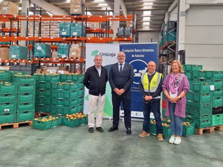 Unicaja donará 10.000 kilos de peras procedentes de la Finca Las Huelgas, de Villamayor (Asturias), a la Fundación Banco de Alimentos de Asturias para que pueda distribuirlas entre sus beneficiarios. La primera parte de esta entrega, de 1.500 kilos de fruta, se ha realizado en la sede de la organización en Asturias, con la presencia de Luis Manuel Taboada, director Territorial Norte de Unicaja, y de Bernardo Sopeña, Josefa Cañadas y Juan José Cima, presidente, vicepresidenta y secretario de la Fundación Banco de Alimentos de Asturias, respectivamente.