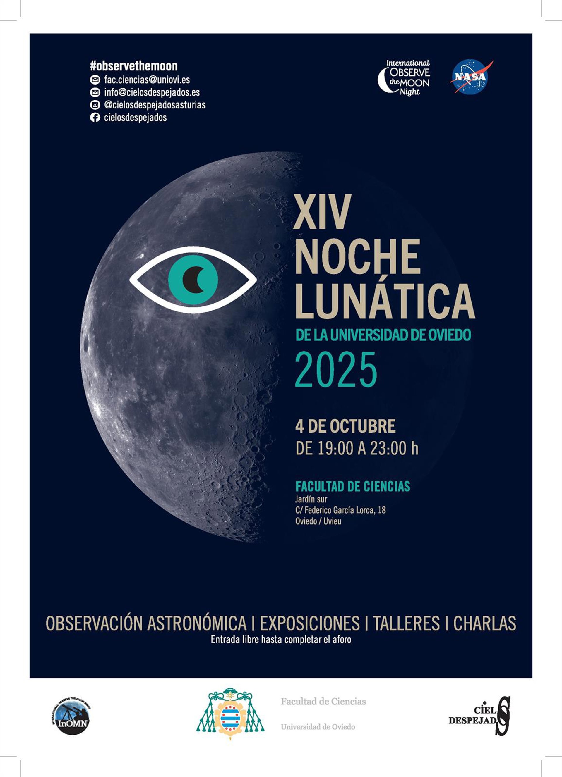 La Asociación Cielos Despejados se une a la Facultad de Ciencias de la Universidad de Oviedo para celebrar la decimocuarta Noche Internacional de Observación a la Luna, promovida por la NASA. El objetivo es acercar el satélite a la Tierra y aprender un poco más sobre él.
