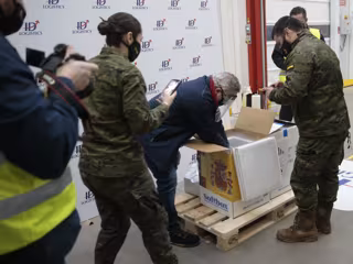 El Gobierno de España ha distribuido este sábado las primeras dosis de la vacuna frente al COVID-19 desarrollada por la compañía Pfizer desde un almacén de Guadalajara. Se están repartiendo a lo largo de este sábado de forma equitativa entre los puntos designados por todas las comunidades y ciudades autónomas para comenzar este domingo la vacunación.