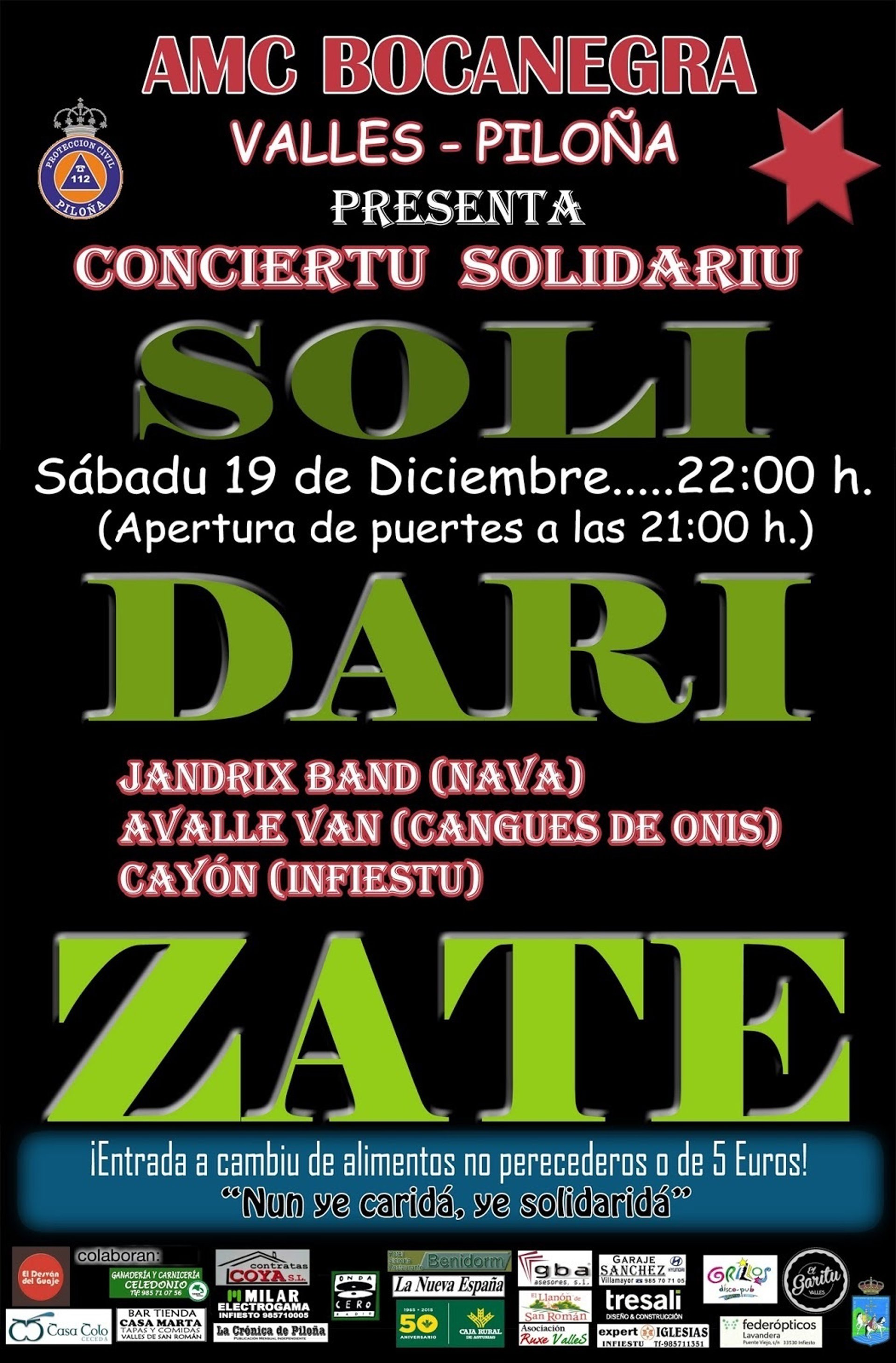 La asocuación músico-cultural (AMC) Bocanegra, en colaboración con Protección Civil de Piloña, acogerá este sábado día 19 de diciembre un concierto solidario en Valles. El objetivo, según ha informado la organización del evento, es aprovechar estas fechas para solidarizarse con las familias que menos recursos tienen.