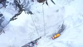 Vista aérea del Puerto de San Isidro, en Aller, donde continúan las labores de búsqueda del operario desaparecido el pasado 1 de enero tras un alud que arrastró la máquina quitanieves en la que trabajaba. - SEPA