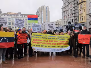 La Asociación de Pensionistas de Venezuela en Asturias (Asopeve) se ha concentrado este domingo en la Plaza de la Escandalera de Oviedo para reivindicar el cobro de las pensiones al Gobierno venezolano, después de 26 meses de espera para recibir esta prestación.