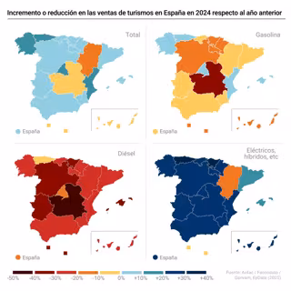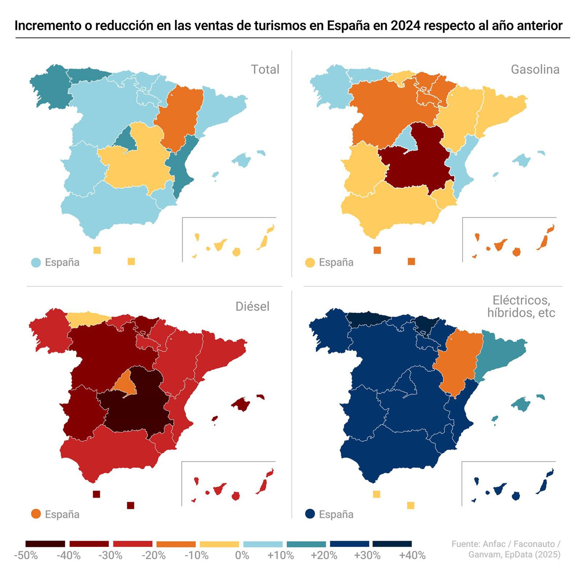Mapas con variación de las matriculaciones de vehículos por comunidades autónomas en España. Las ventas de turismos en España cerraron 2024 con un incremento del 7,1%, hasta las 1.016.885 unidades, recuperando los registros previos a la pandemia, que perm - Europa Press