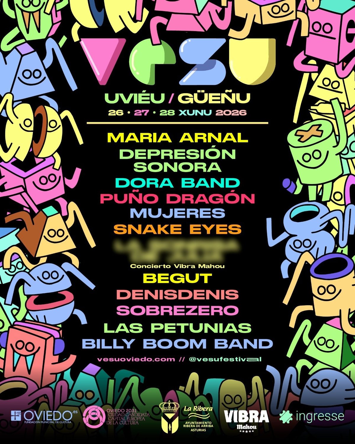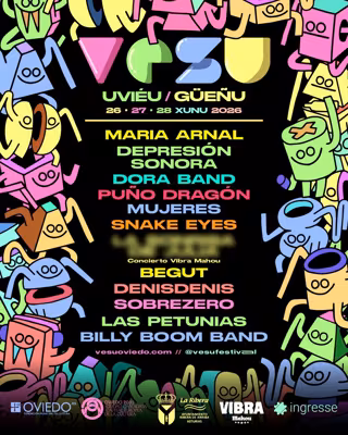 El cartel de VESU 2026 sigue con Begut, que ya estuvo en el festival como parte de la banda de Carlos Ares, presenta ahora su primer álbum. Así mismo desde fuera de nuestras fronteras, y tras un par de años de intensas giras por Reino Unido y Europa, VESU apuesta por el rock crudo y el pop de Snake Eyes. Por último, como guiño a todos los públicos, el cartel se completa con la Billy Boom Band, que se define como una banda de rock para niños apta para mayores. Serán los encargados de cerrar la edición de este año en la Central Artística de Bueño, en un gesto hacia las familias que apoyan el festival.