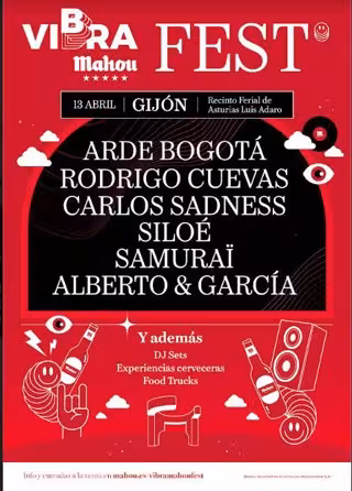 'Vibra Mahou Fest' vuelve a Asturias esta primavera con Arde Bogotá, Rodrigo Cuevas o Alberto & García, entre otros artistas. La tercera edición de este festival tendrá lugar el próximo sábado 13 de abril en el Recinto Ferial de Asturias Luis Adaro, en Gijón. Las entradas están disponibles ya en www.mahou.es/vibramahoufest