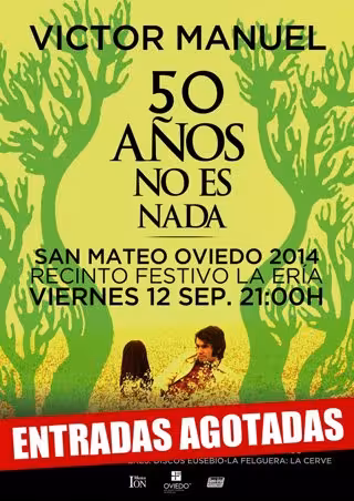 El concierto '50 años no es nada' con el que el cantante Víctor Manuel celebra su 50 aniversario en el mundo de la música ha levantado tal expectación en toda España que las 10.000 entradas puestas a la venta para su concierto del viernes 12 de septiembre en las fiestas de San Mateo 2014 de Oviedo se agotaron completamente en seis días.