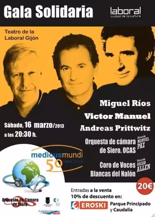 Así, Medicus Mundi celebra sus 50 años con la reaparición de Miguel Ríos, tras su retirada de los escenarios, en un concierto solidario en el que ofrecerá junto a Víctor Manuel varios de sus temas más emblemáticos en versión sinfónica, con los cincuenta integrantes de la Orquesta de Cámara de Siero, treinta mujeres jóvenes internacionalmente premiadas del Coro de Voces Blancas del Nalón, y con la presencia del saxofonista Andreas Prittwitz.