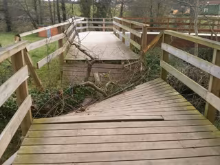 La caída de un humeru (aliso) sobre la plataforma de madera de la senda peatonal del río Magdalena causó el viernes daños importantes de modo que los dos accesos al paseo permanecen cerrados, a la espera de la reparación. En la senda del río Arlós, en Llaranes, la caída de otro humeru provocó daños en el cierre de la antigua escuela de aprendices.