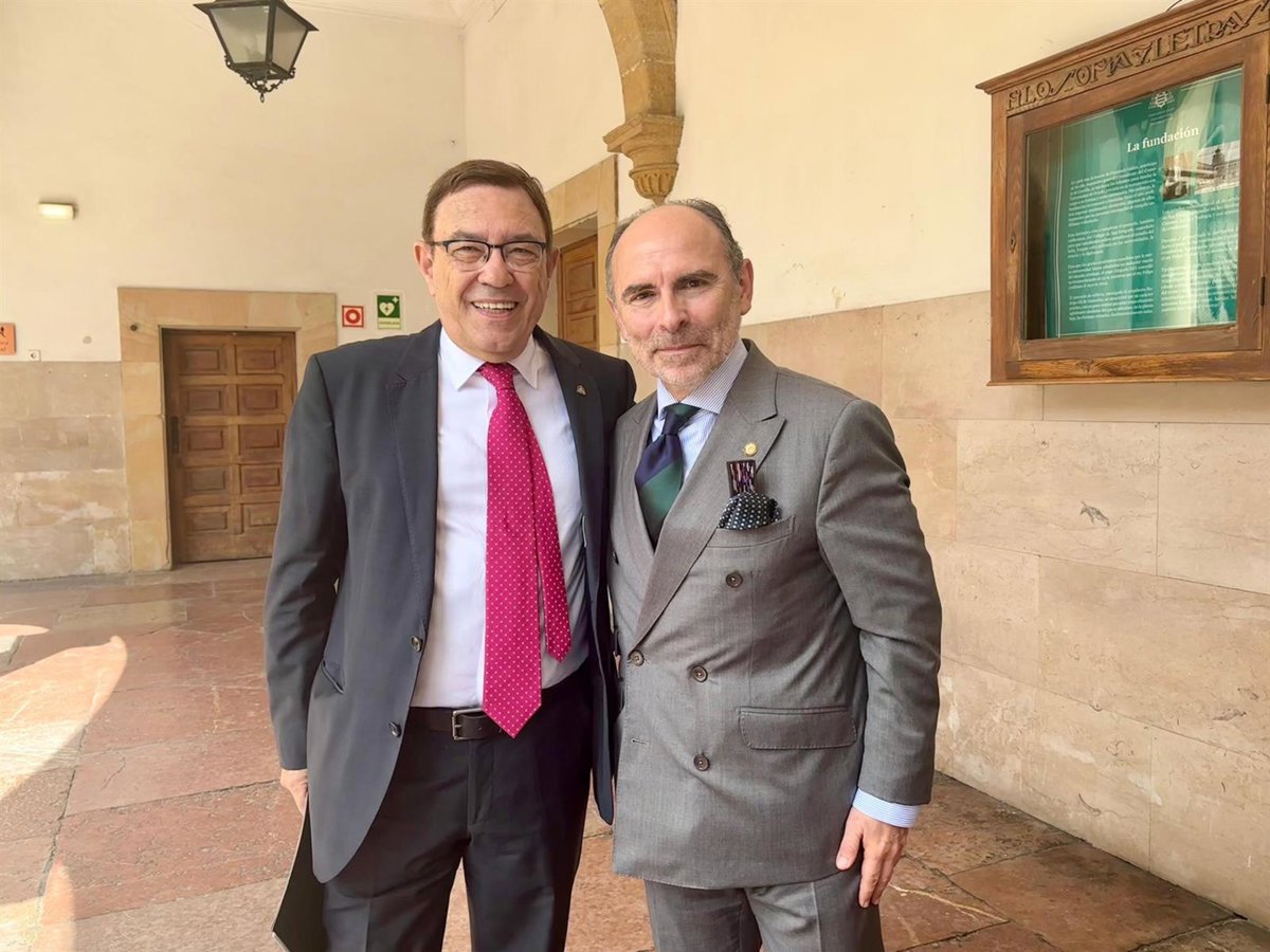 El economista y exrector de la Universidad de Oviedo, Juan Vázquez y el rector actual, Ignacio Villaverde, en el acto de la presentación del libro 'Una pasión universitaria. Escritos en homenaje al profesor Juán Vázquez'. - EUROPA PRESS