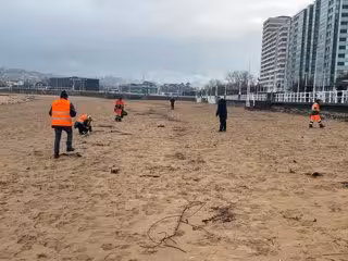 Operarios de Emulsa buscan restos de pélets en la playa de San Lorenzo, en Gijón. - EMULSA