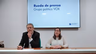 La portavoz de Vox en el Ayuntamiento de Oviedo, Sonsoles Peralta, y el diputado en la JGPA Javier Jové en rueda de prensa. - EUROPA PRESS