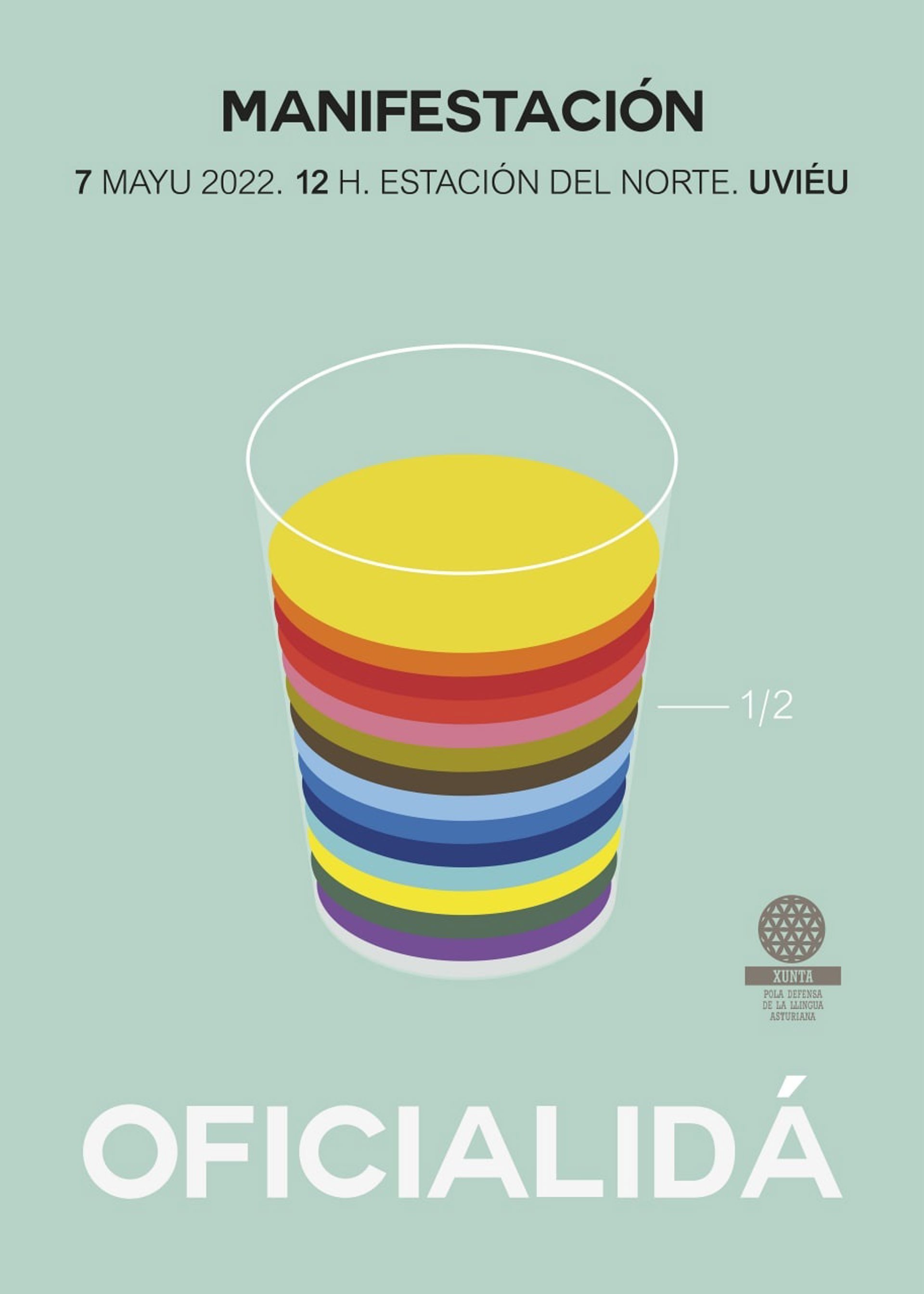El cartel de la convocatoria es un vaso con varios colores --en alusión al corazón multicolor que viene usando la organización en los últimos meses en sus campañas-- que está "medio lleno y que la gente tiene que ayudar a llenar". Así, quieren representar la situación actual del debate político sobre la oficialidad y el papel del movimiento de reivindicación lingüística.