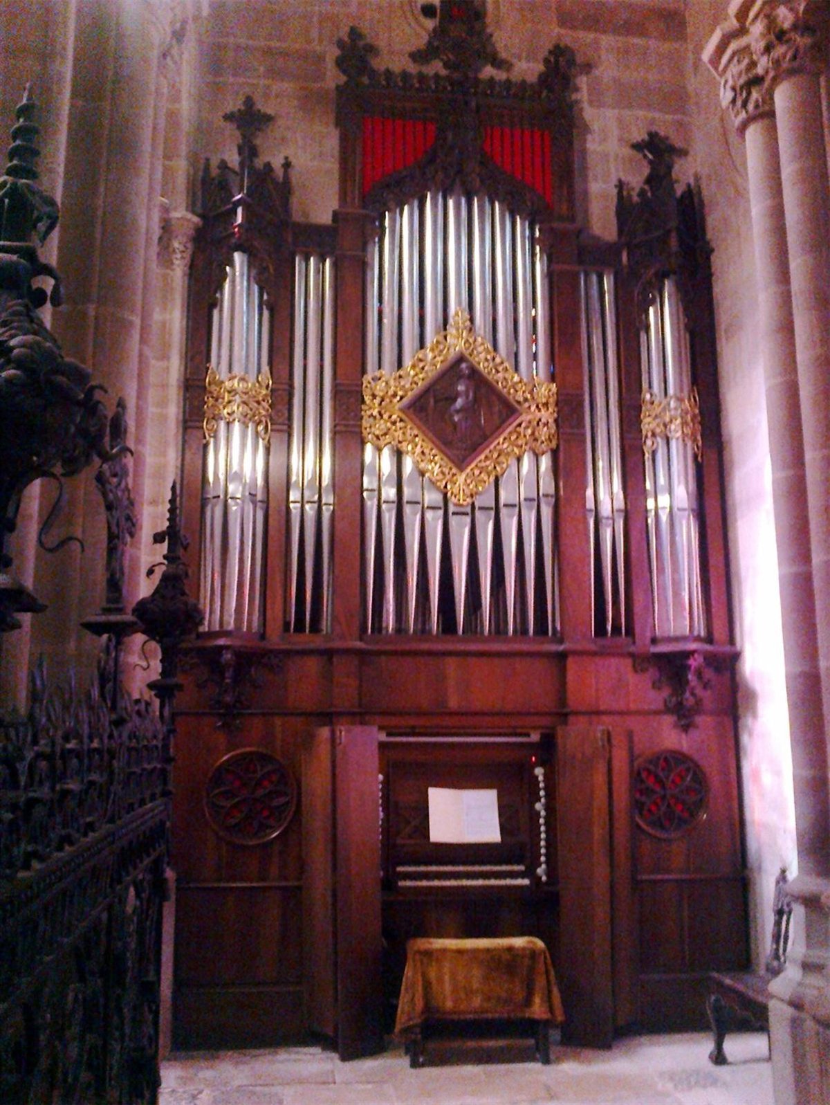 Según se explica en el dosier, se trata de un órgano romántico, totalmente mecánico, que se sitúa en el lado del Evangelio de la capilla. Su fachada neogótica es acorde con la fábrica del templo; en el cuerpo central consta de un relieve en madera que representa a Santa Cecilia y en la parte superior el rostro de Eolo. La consola es de ventana y la transmisión mecánica. Conserva el fuelle manual aunque tiene motor eléctrico.
