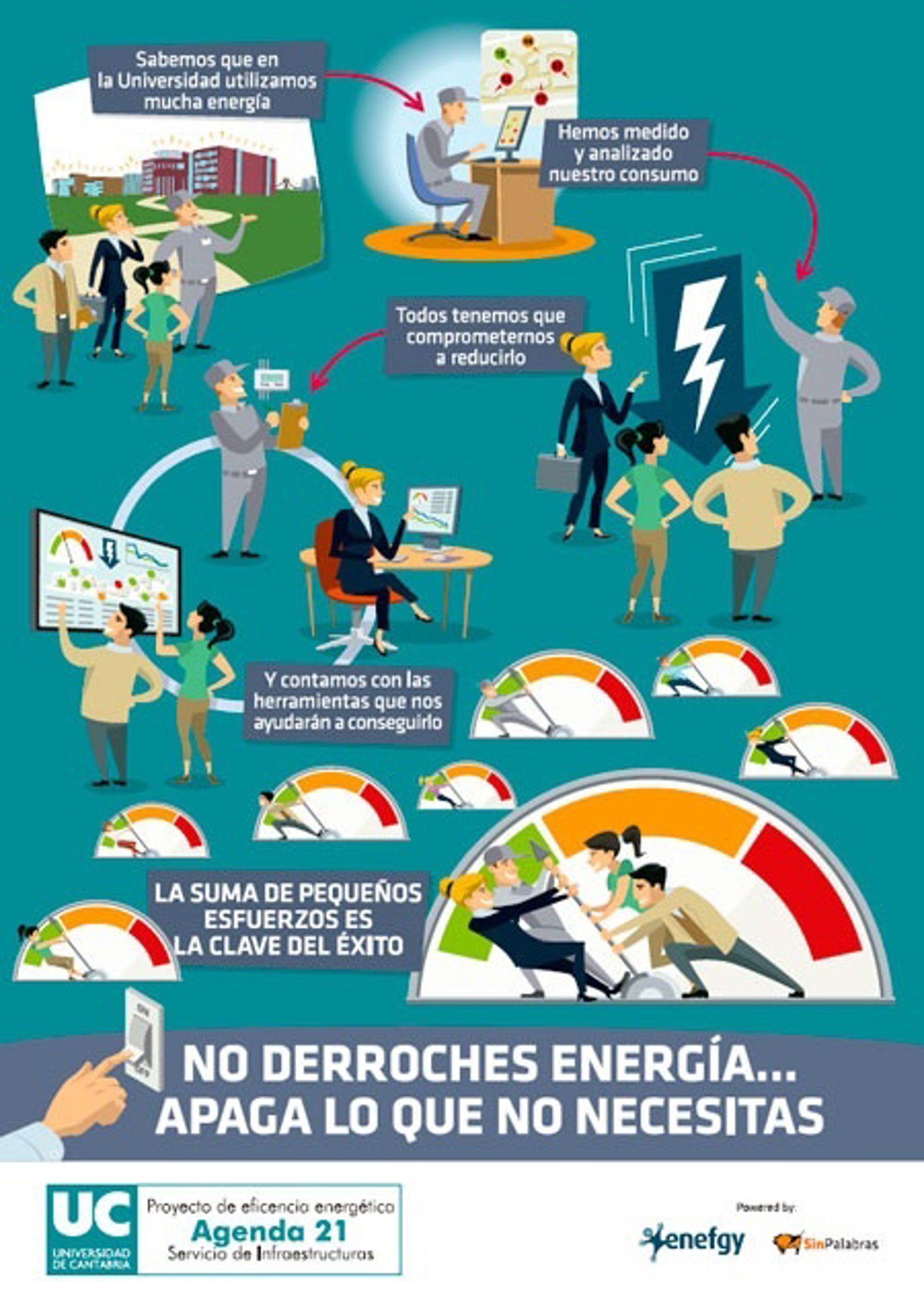 Esta campaña para promover la eficiencia energética en el Campus está diseñada por el Servicio de Infraestructuras de la UC, junto a la empresa Enefgy y la agencia Sin Palabras, y se enmarca dentro de las estrategias de sostenibilidad marcadas por la Agenda 21 Local y su aplicación al entorno universitario a través del programa 'Ecocampus Las Llamas'.