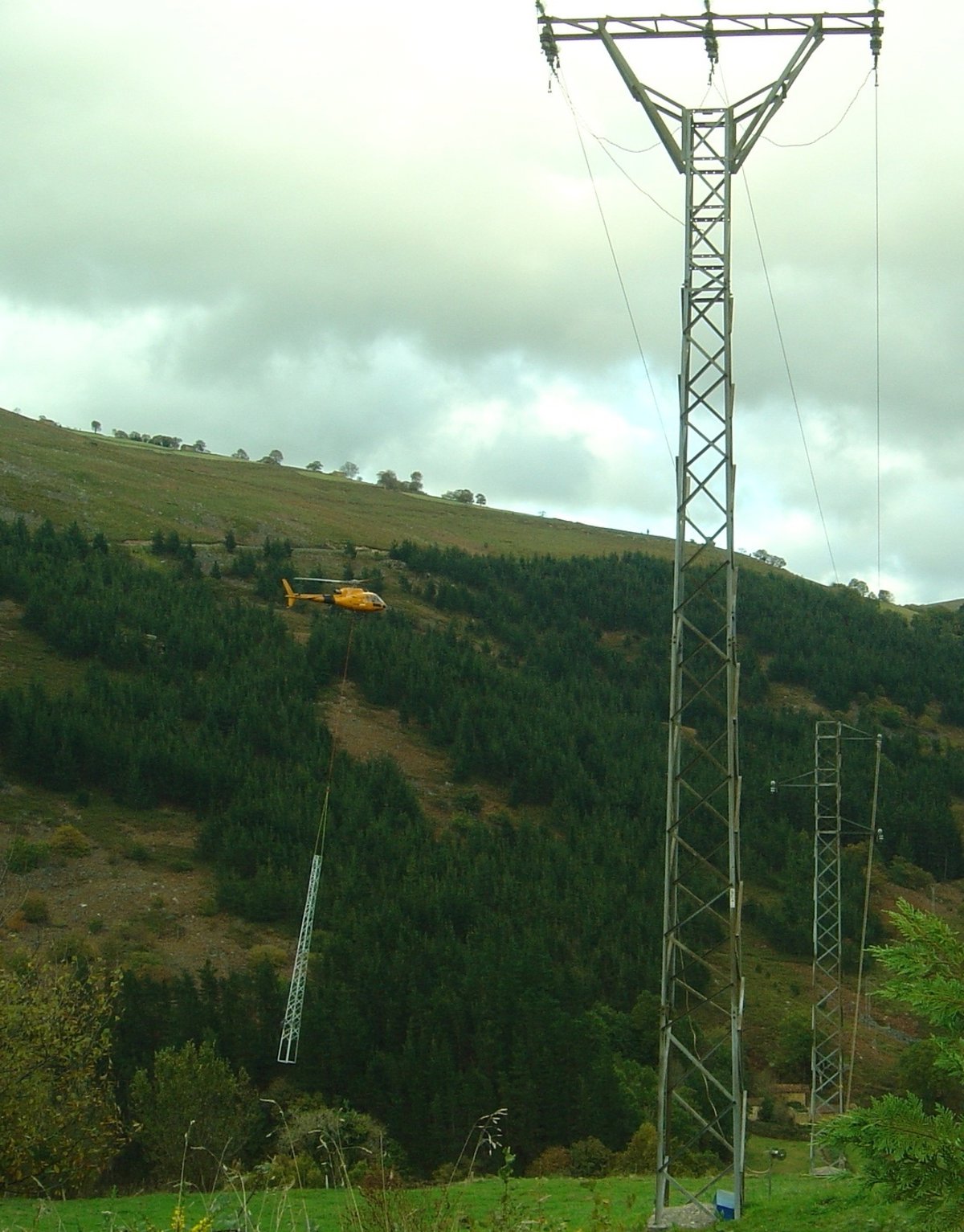 Debido al difícil acceso de la zona y a la complejidad de la obra, ha sido necesario emplear un helicóptero para el izado, acopio y hormigonado de dos apoyos metálicos en la zona de Bollacín (Luena), junto al puerto de El Escudo, según ha informado la compañía.