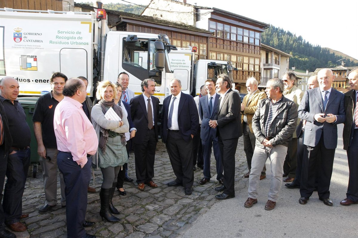 El consejero de Medio Ambiente, Ordenación del Territorio y Urbanismo, Javier Fernández, junto con el director de Mare, Antonino Zabala, ha presentado este lunes en la plaza de Vega de Pas el nuevo servicio de recogida de residuos urbanos de la zona Pas-Pisueña.