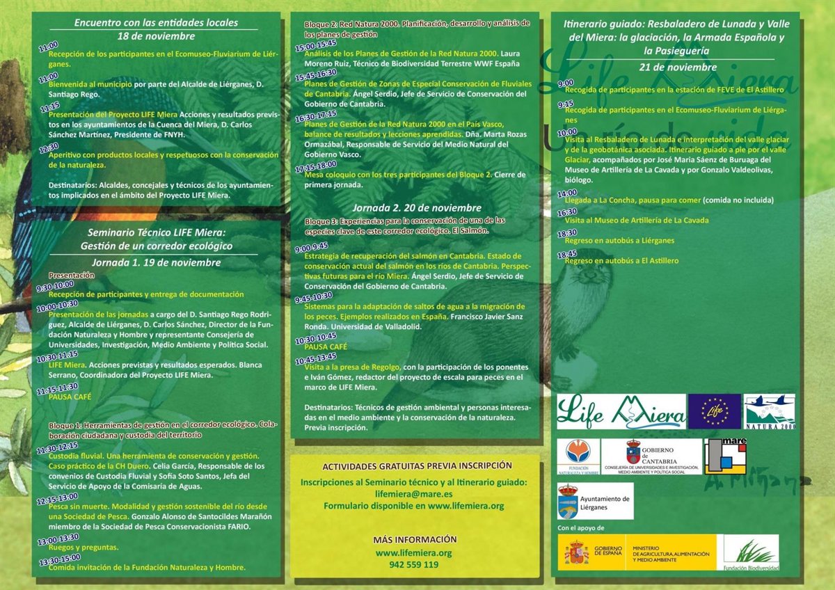 El jueves 19 y el viernes 20 estarán reservados para la celebración del 'Seminario técnico LIFE Miera: gestión de un corredor ecológico'. A lo largo de estas dos jornadas, técnicos en materia ambiental y población local se reunirán para hablar sobre conservación fluvial, custodia del territorio y colaboración ciudadana, planificación de espacios Natura 2000 y conectividad ecológica, en el ejemplo de la migración del salmón.
