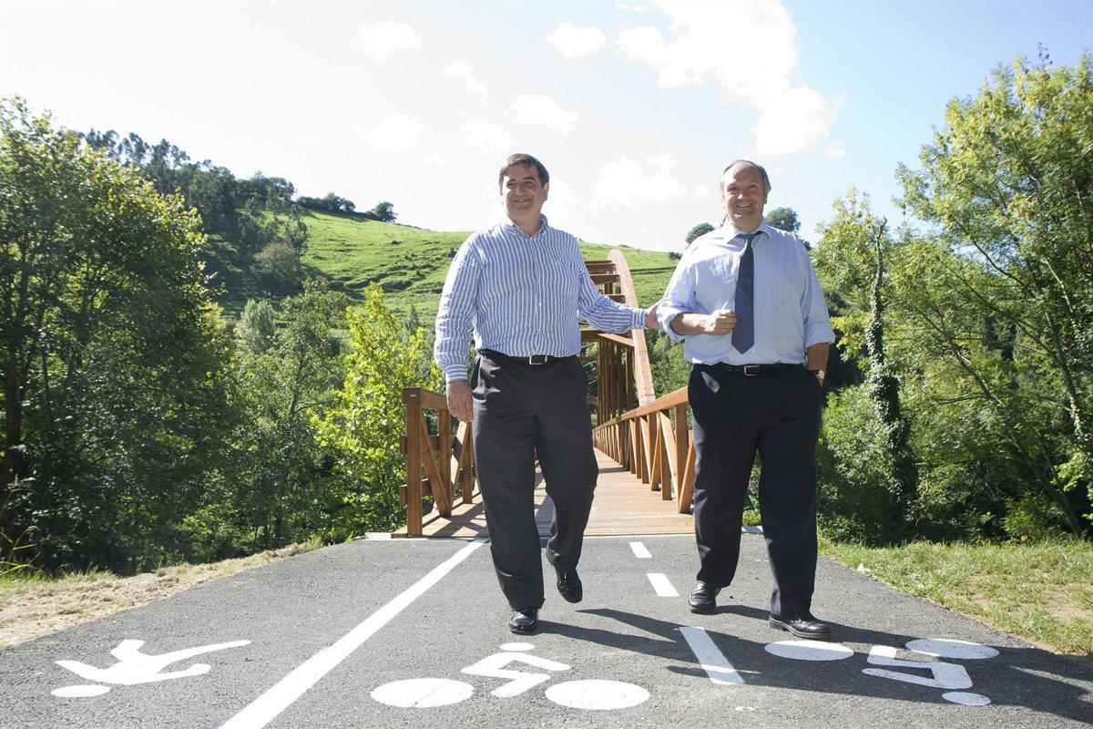 El consejero de Medio Ambiente, Ordenación del Territorio y Urbanismo, Javier Fernández, y el alcalde de Ramales de la Victoria, José Domingo San Emeterio, han inaugurado este viernes el carril bici y la senda peatonal en el parque de Cubillas.