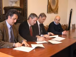 El consejero de Medio Ambiente de Cantabria, Francisco Martín, el alcalde de Suances, Andrés Ruiz Moya, acompañado por el concejal de Urbanismo, Isaac Bolado, y el secretario del Consejo de Administración de Asturiana de Zinc (AZSA), Íñigo Abarca, han firmado este lunes en el Ayuntamiento de Suances el convenio para la coordinación de actuaciones necesarias que permitan ejecutar un carril bici en Hinojedo.