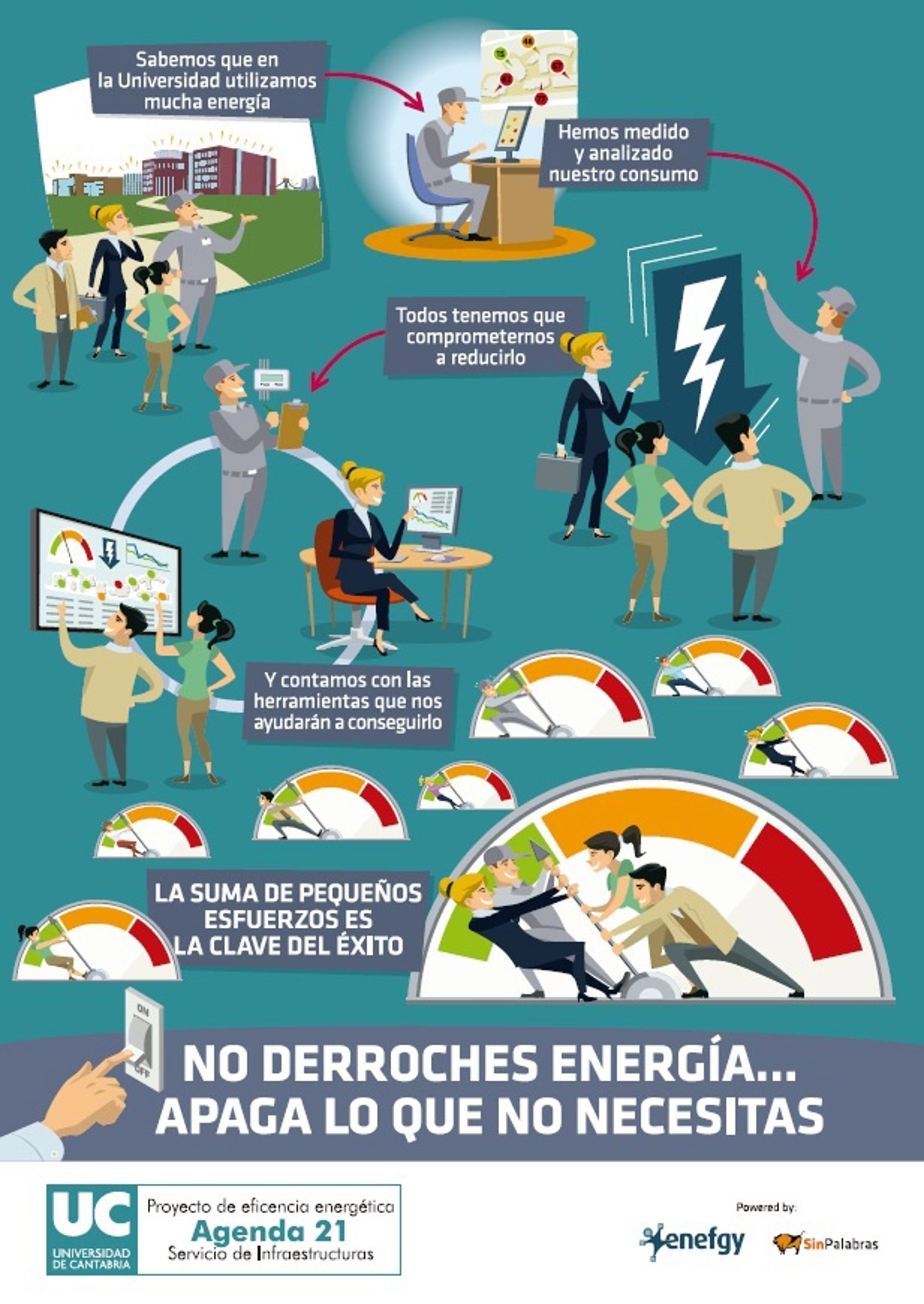 El Servicio de Infraestructuras de la UC ha diseñado para ello, junto a la empresa Enefgy y la agencia Sin Palabras, unos carteles informativos que ofrecen datos sobre los consumos en varios centros, para concienciar a la comunidad universitaria de la necesidad de no derrochar energía, bajo el lema "Con pequeños gestos podemos conseguirlo".