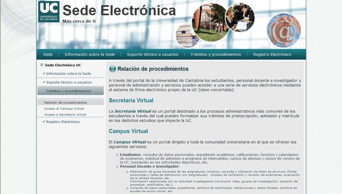 Por medio de la Sede Electrónica de la UC se podrá acceder a la información necesaria para la utilización de los servicios electrónicos de la UC y al catálogo de procedimientos administrativos de que esta institución dispone, desde cualquier lugar.
