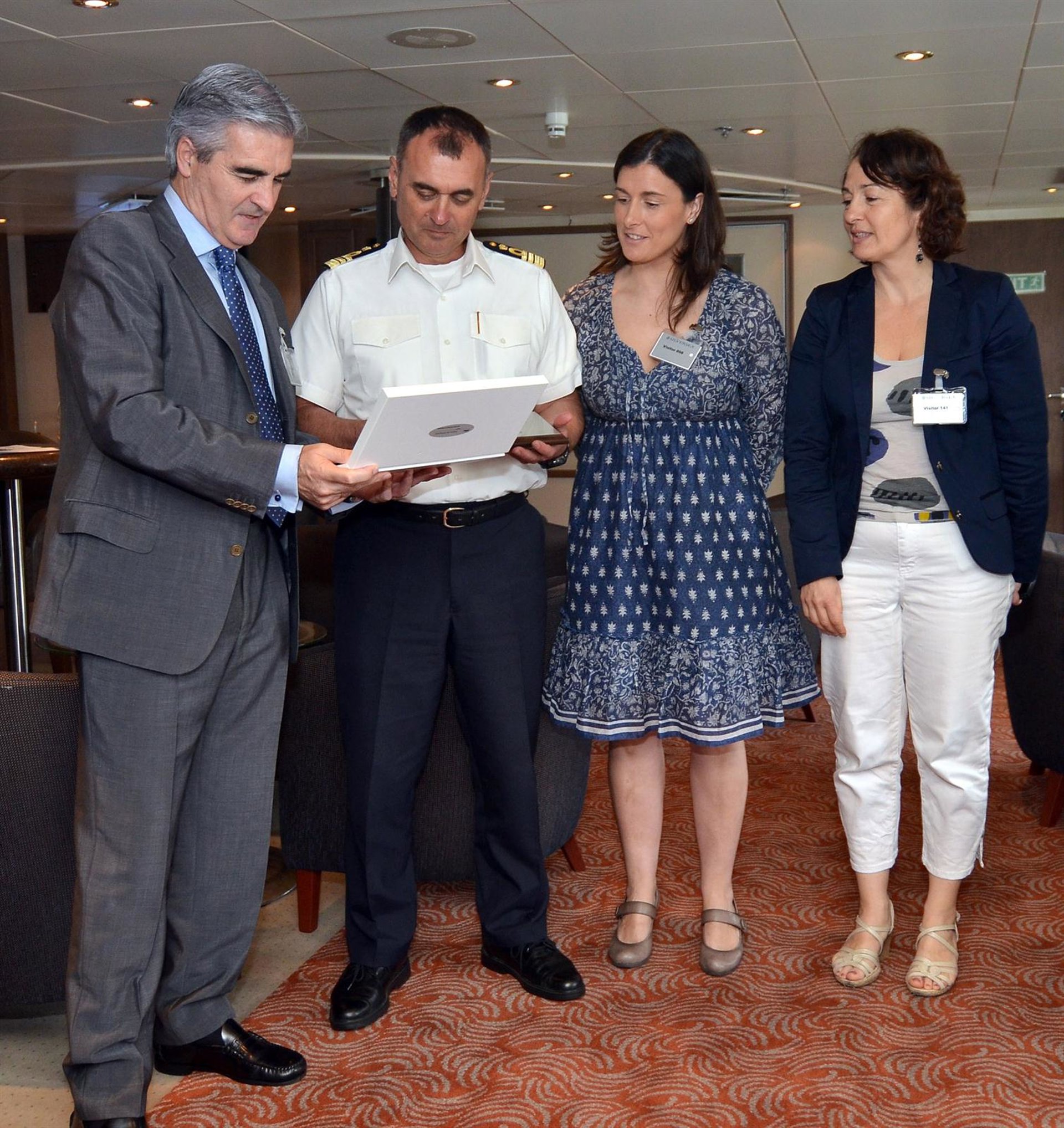 Además de la metopa conmemorativa, el presidente de la Autoridad Portuaria y la concejala de Turismo facilitaron al capitán información sobre el futuro Centro de Arte Botín. Por su parte, el capitán les describió algunas de las rutas turísticas que realiza este barco por diferentes puntos del planeta, desde Norteamérica, Centroamérica o Norte de África, al Ártico o el Antártico.