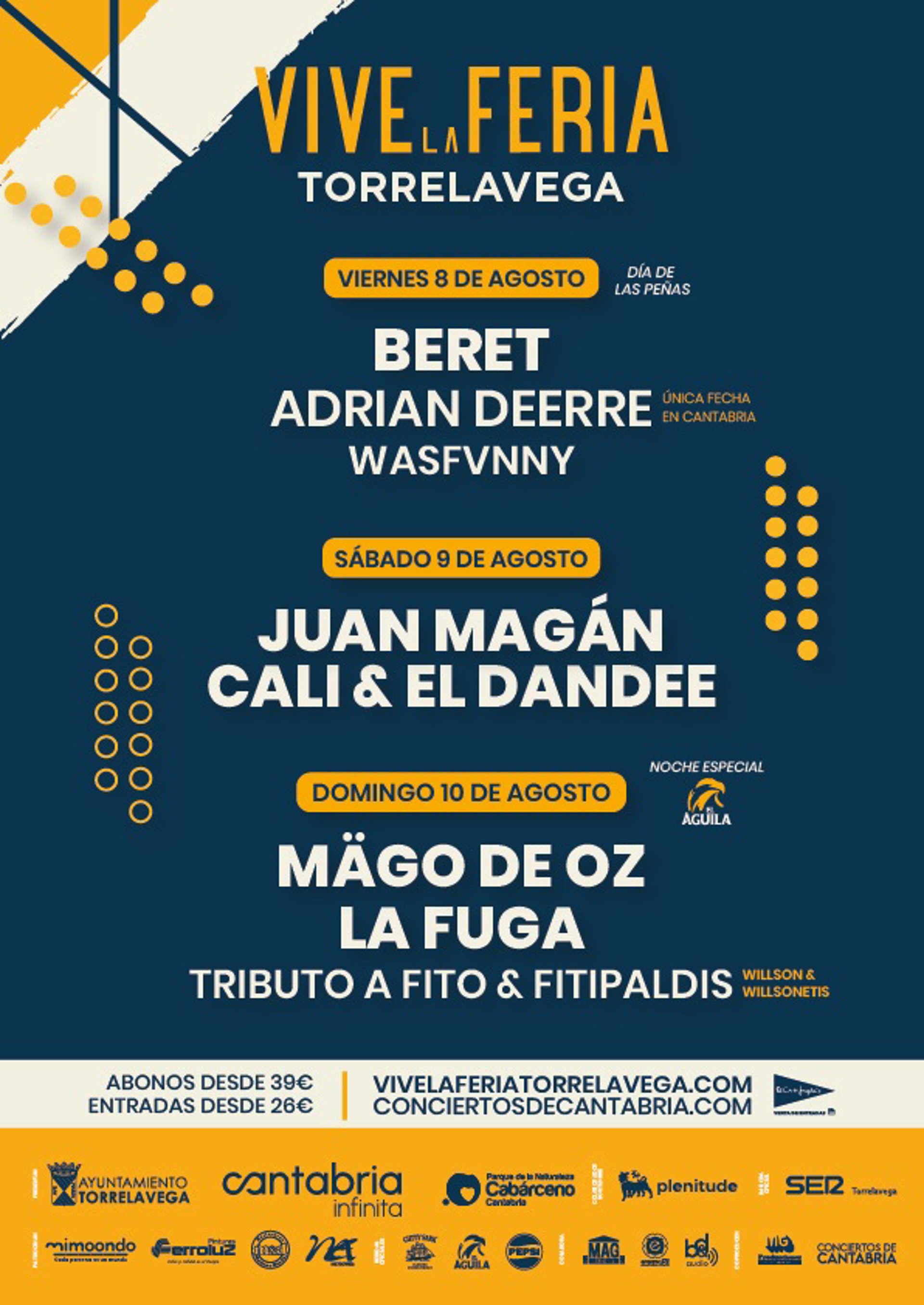 Beret, Cali & El Dandee, Juan Magán, Mägo de Oz y La Fuga serán los protagonistas de la próxima edición del festival Vive la Feria de Torrelavega, que se celebrará entre 8 y el 10 de agosto en el exterior de la Feria de Muestras de La Lechera e incluirá además las actuaciones de Adrián Deerre, Wasfvnny y un tributo a Fito & Fitipaldis.