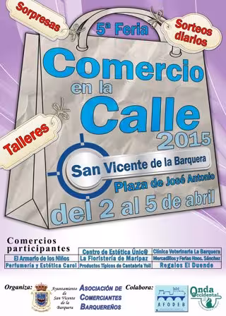 San Vicente de Barquera acoge esta Semana Santa, hasta el domingo 5 de abril, la V Feria en la Calle 2015, que se ubica en la plaza de José Antonio y donde se pueden encontrar productos de perfumería, regalos, estética, floristería, juguetes, ropa para niños, despensa típica de Cantabria, frutos secos y hasta una clínica veterinaria.
