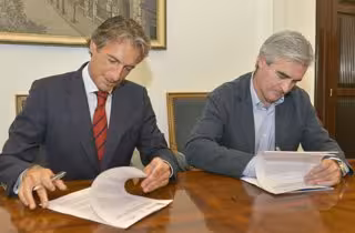El alcalde de Santander, Iñigo de la Serna, y el presidente de la Autoridad Portuaria, José Joaquín Martínez Sieso, han firmado el convenio por el que se ponen a disposición del Ayuntamiento los terrenos portuarios necesarios para ejecutar las obras del paseo marítimo de Marqués de la Hermida, que irá desde la calle Héroes de la Armada hasta La Marga.