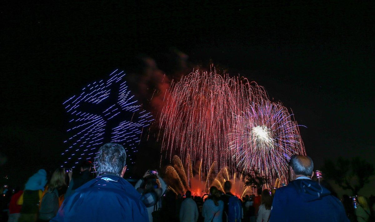 En el comienzo del espectáculo, que arrancó pasadas las 23.00 horas, los drones dibujaron en el cielo el 'Lignum Crucis' y, posteriormente, otros elementos vinculados al Año Jubilar y, en general, a Cantabria, todo ello acompañado de música y fuegos artificiales.