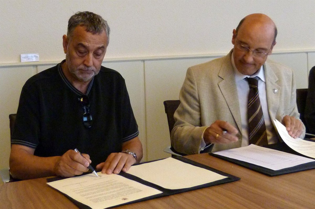 El rector de la Universidad de Cantabria, Federico Gutiérrez-Solana y el artista Eloy Velázquez Gómez han firmado el acuerdo de la cesión del conjunto escultórico de este autor, 'Desde el sur del silencio', a la entidad académica.