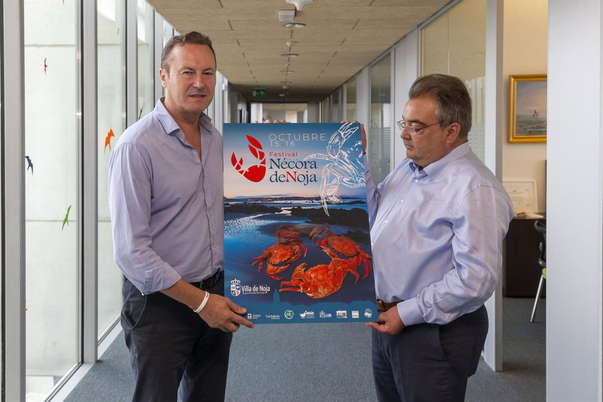 El consejero de Desarrollo Rural, Ganadería, Pesca, Alimentación y Medio Ambiente, Guillermo Blanco, presenta, junto al alcalde de Noja, Miguel Ángel Ruiz, el cartel de la gala de la Nécora. - GOBIERNO DE CANTABRIA