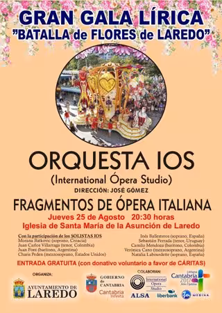 La iglesia de Santa María de la Asunción de Laredo acogerá este jueves una Gala Lírica dentro de la Semana Grande de la Batalla de las Flores. En el concierto, protagonizado por la Orquesta IOS (International Opera Studio) de Gijón, dirigida por José Gómez, participarán diez solistas de diferentes nacionalidades.