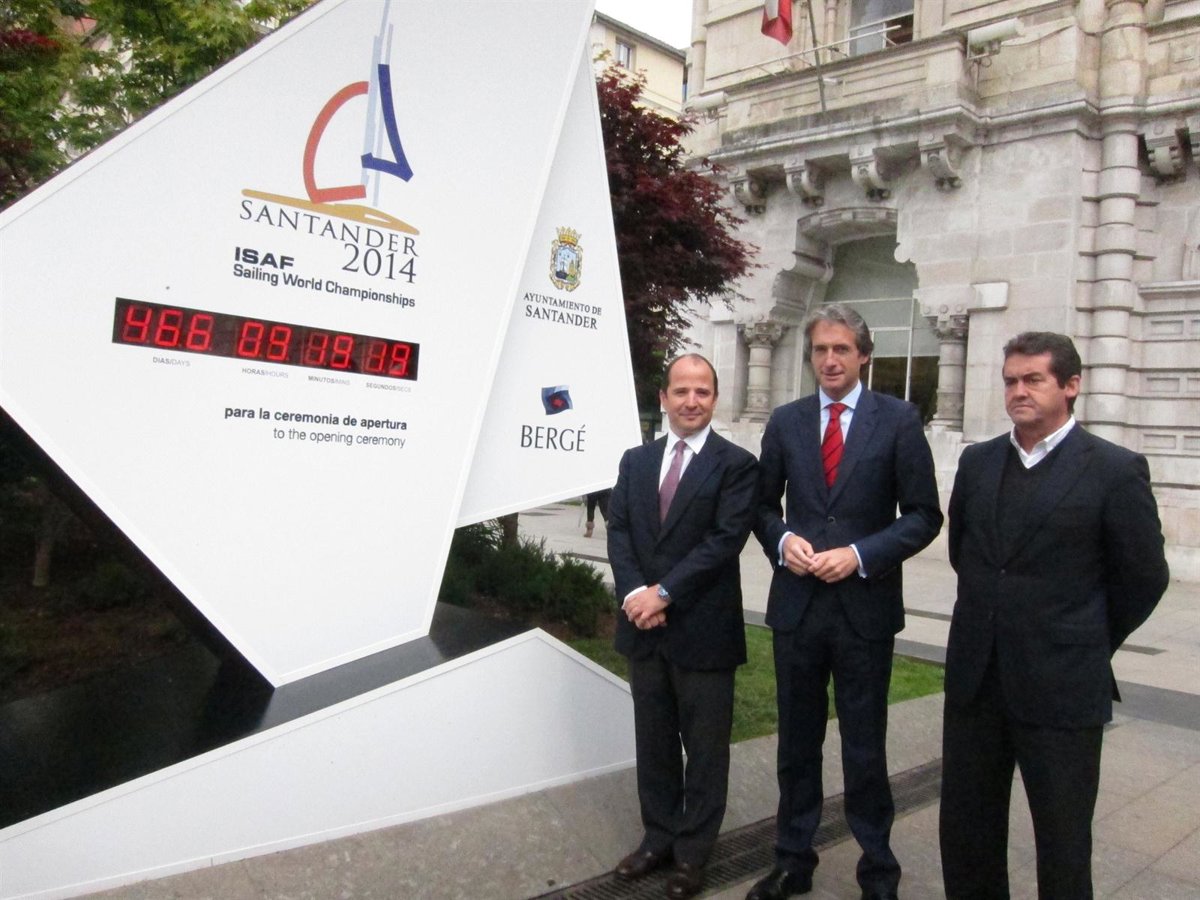 El alcalde de Santander, Iñigo de la Serna, acompañado del presidente de la Federación Española de Vela, José Ángel Rodríguez, y el presidente de Bergé Marítima (patrocinador de esta iniciativa), Jaime Gorbeña, han inaugurado este reloj que indica que restan 466 días para la celebración.