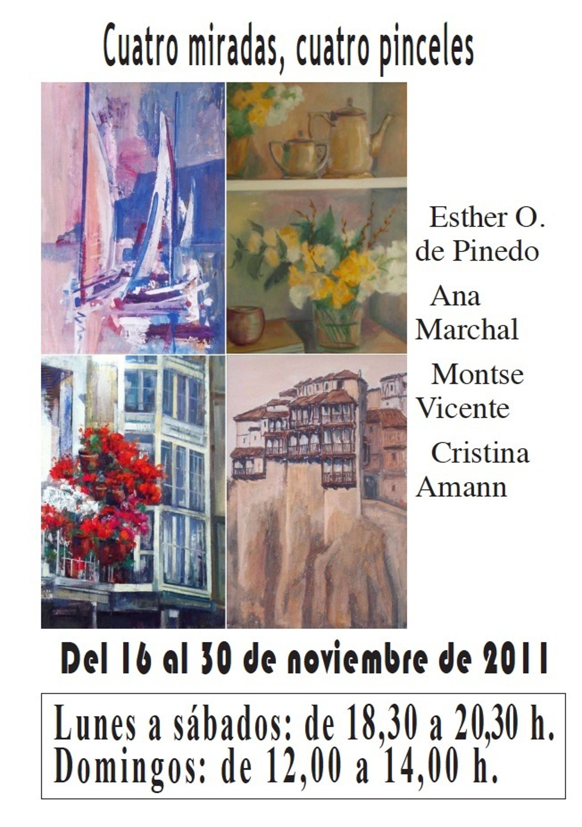 La Sala de Exposiciones Víctor de los Ríos, ubicada en la Casa de Cultura de la Villa de Santoña acogerá la exposición de pinturas "Cuatro miradas, cuatro pinceles" realizada por las artistas Esther Ortiz de Pinedo, Cristina Amann, Montse Vicente y Ana María Marchal.