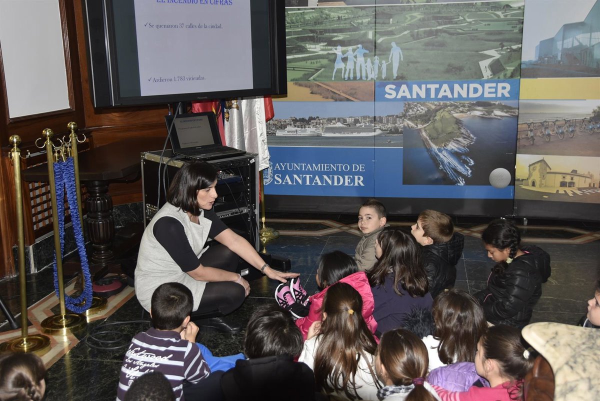 La edil ha acompañado a estos niños en un recorrido por el interior del Consistorio, donde han visto una proyección sobre el incendio de Santander, con motivo de la conmemoración del 75 aniversario.