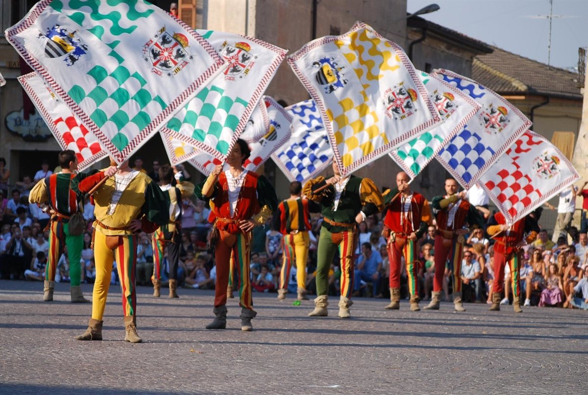 El sonido de tambores y clarines, que recuerdan el origen militar de este espectáculo, acompañará a los sbandieratori durante todo el recorrido con el que se escenifica un cortejo histórico, en el que caballeros y damas, en trajes de época inspirados en el siglo X, animan el desfile.