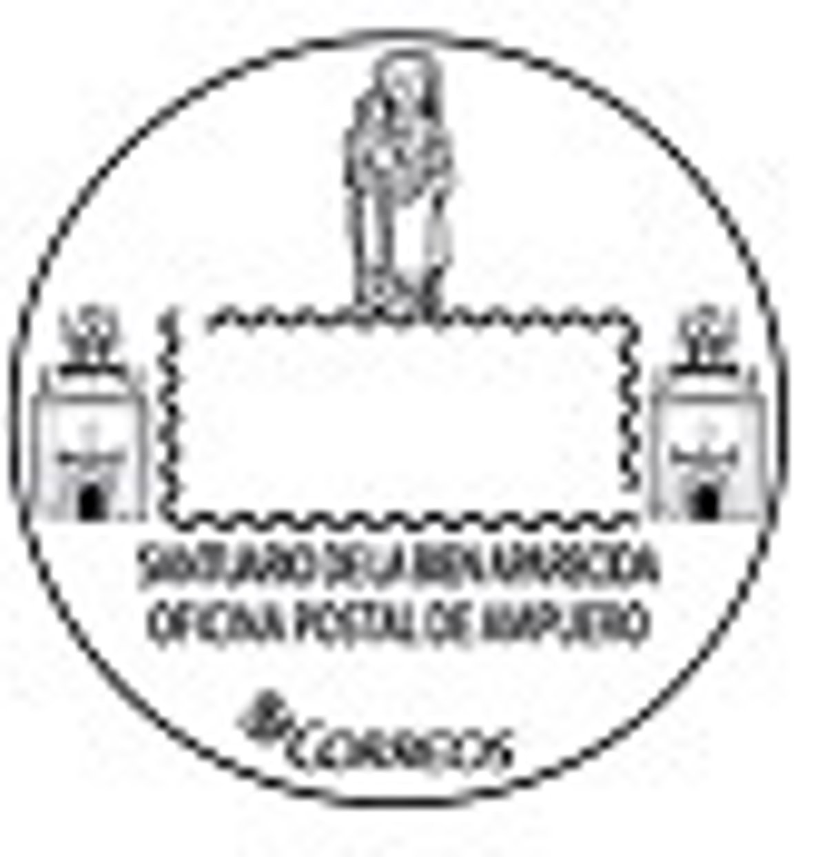 El sellador de la oficina de Ampuero, situada en Federico Somarriba 5, presenta la imagen de la Virgen Bien Aparecida, flanqueada por una doble reproducción de la fachada del Santuario.
