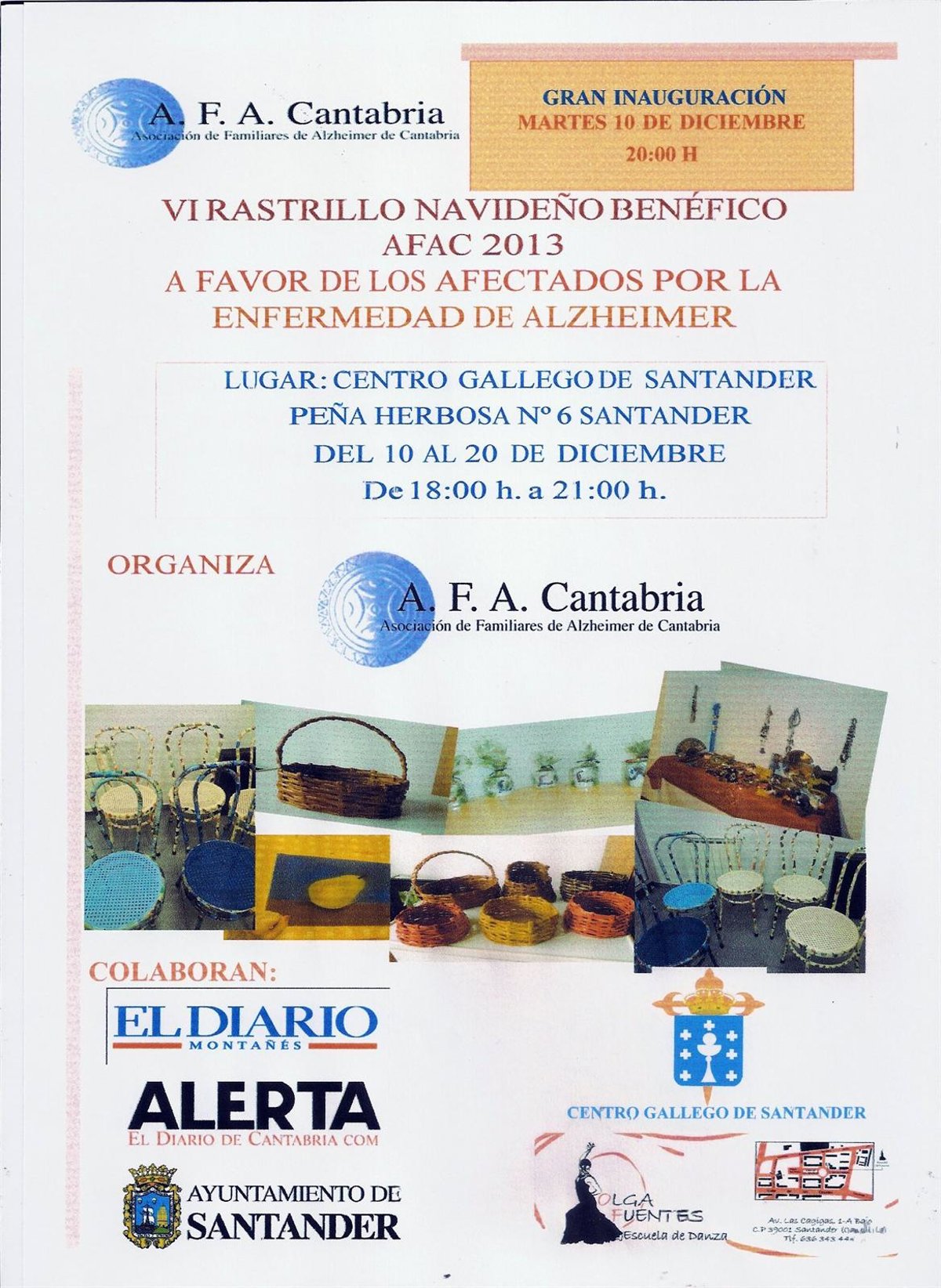 La Asociación de Familiares de Alzheimer de Cantabria (AFAC) inaugura este martes, 10 de diciembre, a las 20.00 horas, en el Centro Gallego de Santander, su rastrillo navideño.