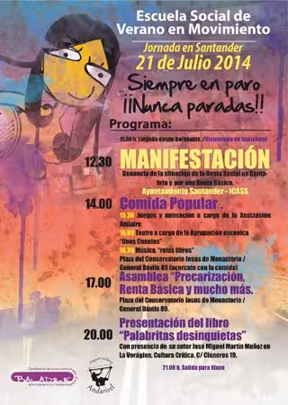 A las 17 horas, celebrarán una asamblea sobre "Precarización Renta Básica y mucho más", y a las 20 horas presentarán el libro "Palabritas Desinquietas" en la Librería La Vorágine.