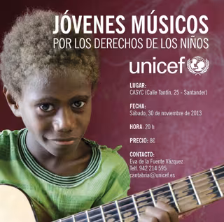 El Centro de Acción Social y Cultural de Caja Cantabria (Casyc)acogerá el próximo sábado 30 de noviembre, a las 20.00 horas, el concierto 'Jóvenes músicos por los derechos de los niños', un evento solidario que destinará la recaudación a apoyar el trabajo que UNICEF realiza en países en vías de desarrollo para mejorar las condiciones de vida de los niños y garantizar que se cumplan sus derechos a la supervivencia, la educación de calidad y la protección frente a los abusos.