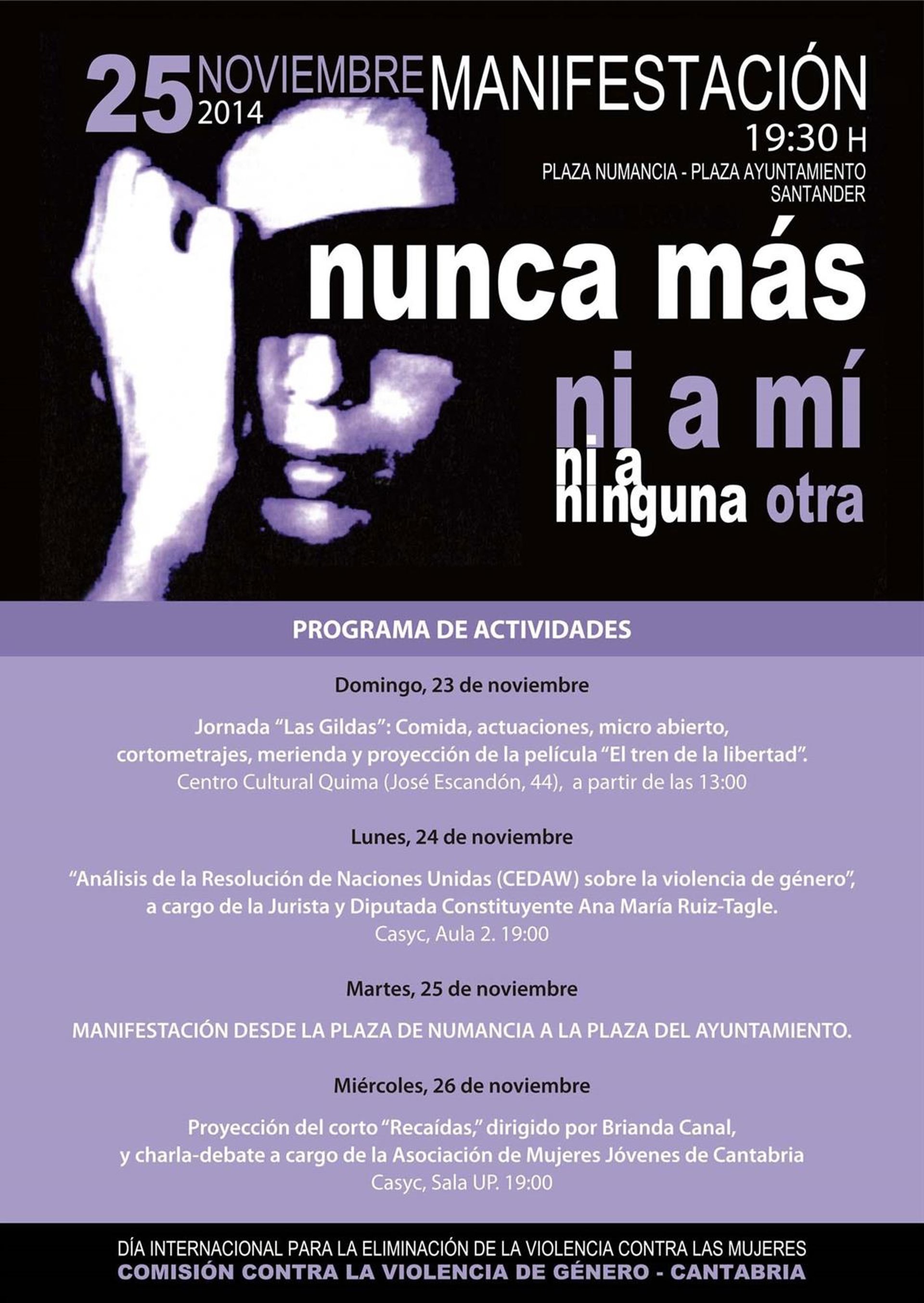 Esta plataforma inició el domingo 23 de noviembre una serie de actos conmemorativos de la jornada internacional contra la violencia de género, que este lunes incluye una conferencia, a las 19 horas en la Casyc, sobre la resolución de la ONU sobre la violencia de género, que será impartida por la jurista y diputada de las primeras Cortes Generales en España, Ana María Ruiz-Tagle.