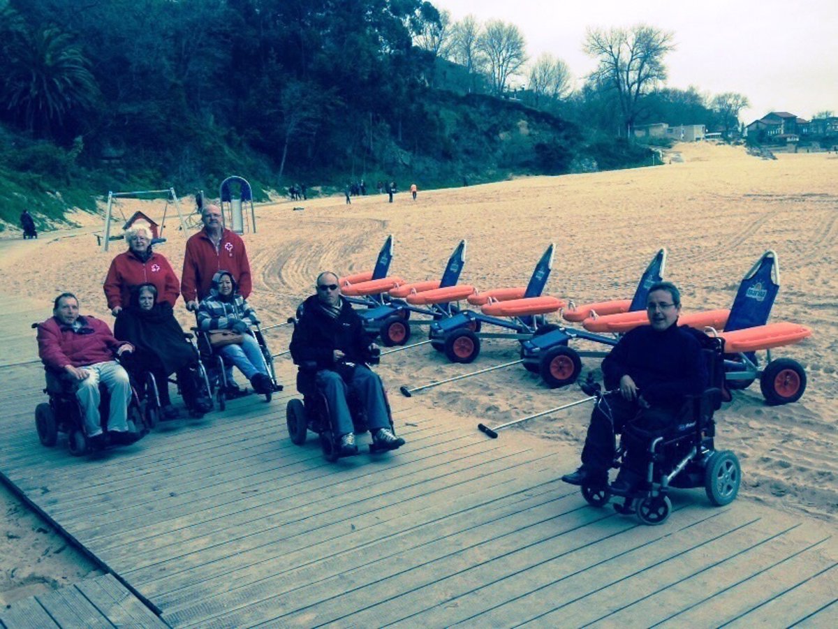 El concejal de Autonomía Personal, Roberto del Pozo, acompañado por la responsable de excursiones y voluntarios de Cruz Roja Cantabria, así como de usuarios del servicio visita en Los Peligros los cinco nuevos bugi o vehículos para el baño de personas con discapacidad.