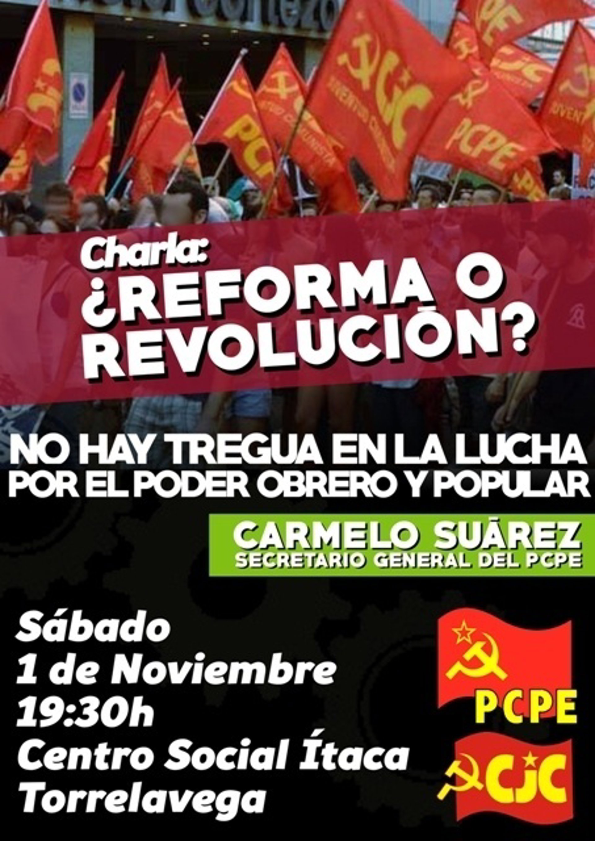 El secretario general del PCPE, Carmelo Suárez, ofrecerá este sabado, 1 de noviembre, la charla titulada '¿Reforma o revolución? No hay tregua por el poder obrero y popular', que tendrá lugar en el Centro Social Itaca de Torrelavega a partir de las 19.30 horas.